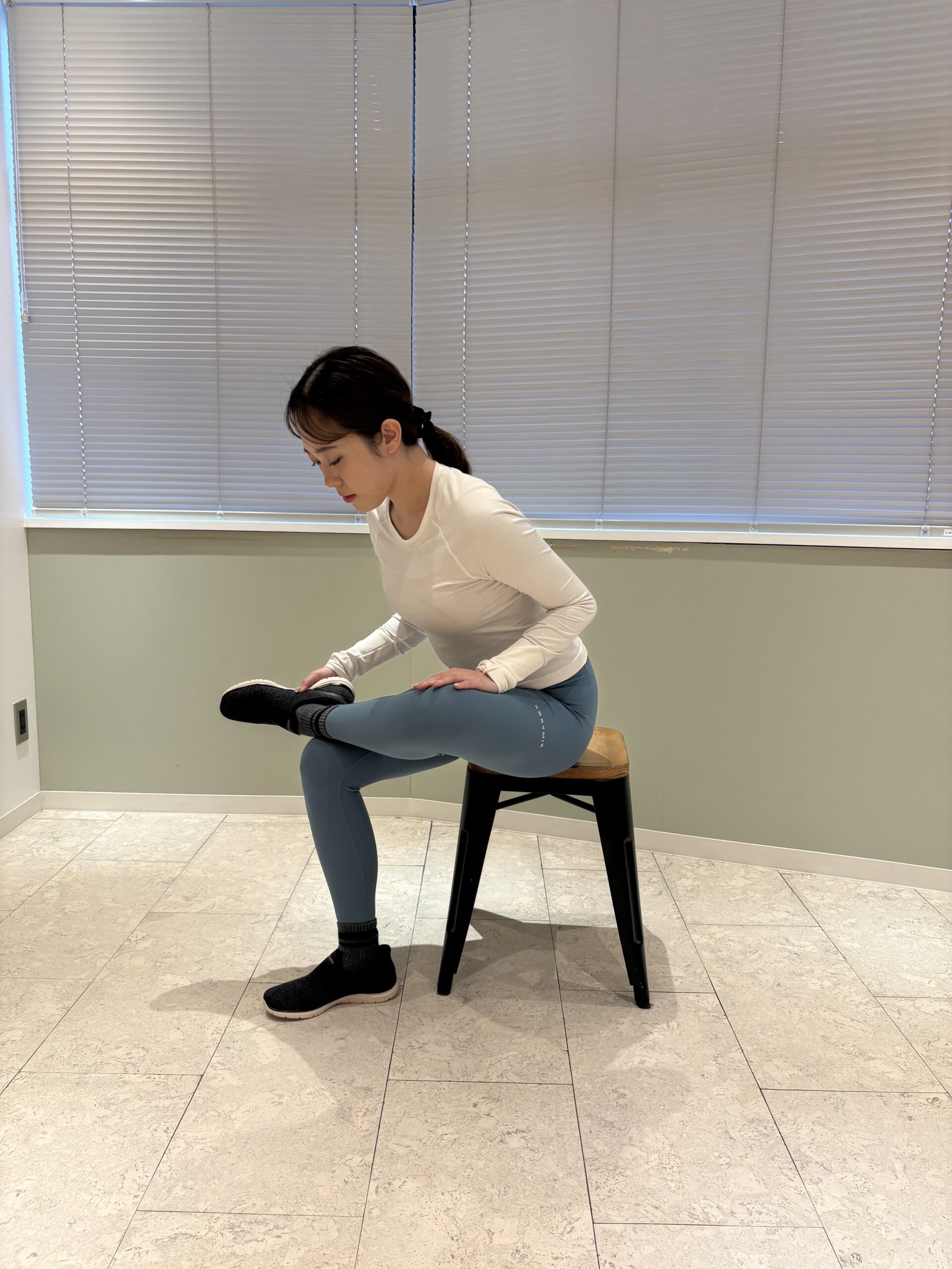 椅子に座り、片足を反対の太ももの上に乗せて「4の字」を作ります。